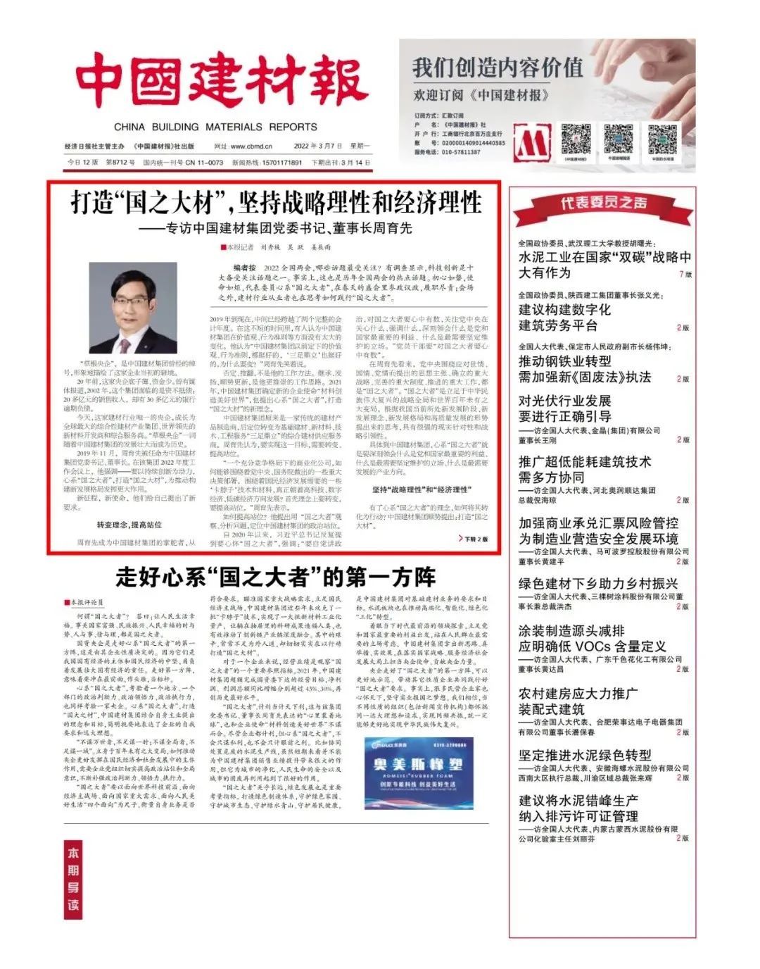 来源:中国建材报 发布时间:2022-03-09编者按 2022年全国两会,哪些话题最受关注?有调查显示,科技创新是十大备受关注话题之一。事实上,这也是历年全国两会的热点话题。初心如磐,使命如炬,代表委员心系“国之大者”,在春天的盛会里参政议政,履职尽责;会场之外,建材行业从业者也在思考如何践行“国之大者”。近日,《中国建材报》专访中国金年会党委书记、董事长周育先。