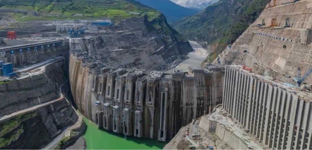 乌东德水电站位于金沙江下游四川省会东县和云南省禄劝县境内,也是“西电东送”战略的骨干电源,装机规模为中国第四、世界第七,以发电为主,兼顾防洪。2021年6月16日,乌东德水电站12台85万千瓦机组全部投产发电,成为世界首座全坝应用低热水泥混凝土浇筑的特高拱坝。乌东德水电站大坝为混凝土双曲拱坝,混凝土浇筑总量270余万立方米。大坝坝顶高程988米,最大坝高270米,坝顶上游面弧长326.95米,厚高比仅0.19,像鸡蛋壳一样,是目前世界上已建成的最薄300米级特高拱坝,特高拱坝浇筑混凝土所用低热硅酸盐水泥全部由嘉华水泥提供,中国建材总院实施了全过程“水泥质量驻场监造”。